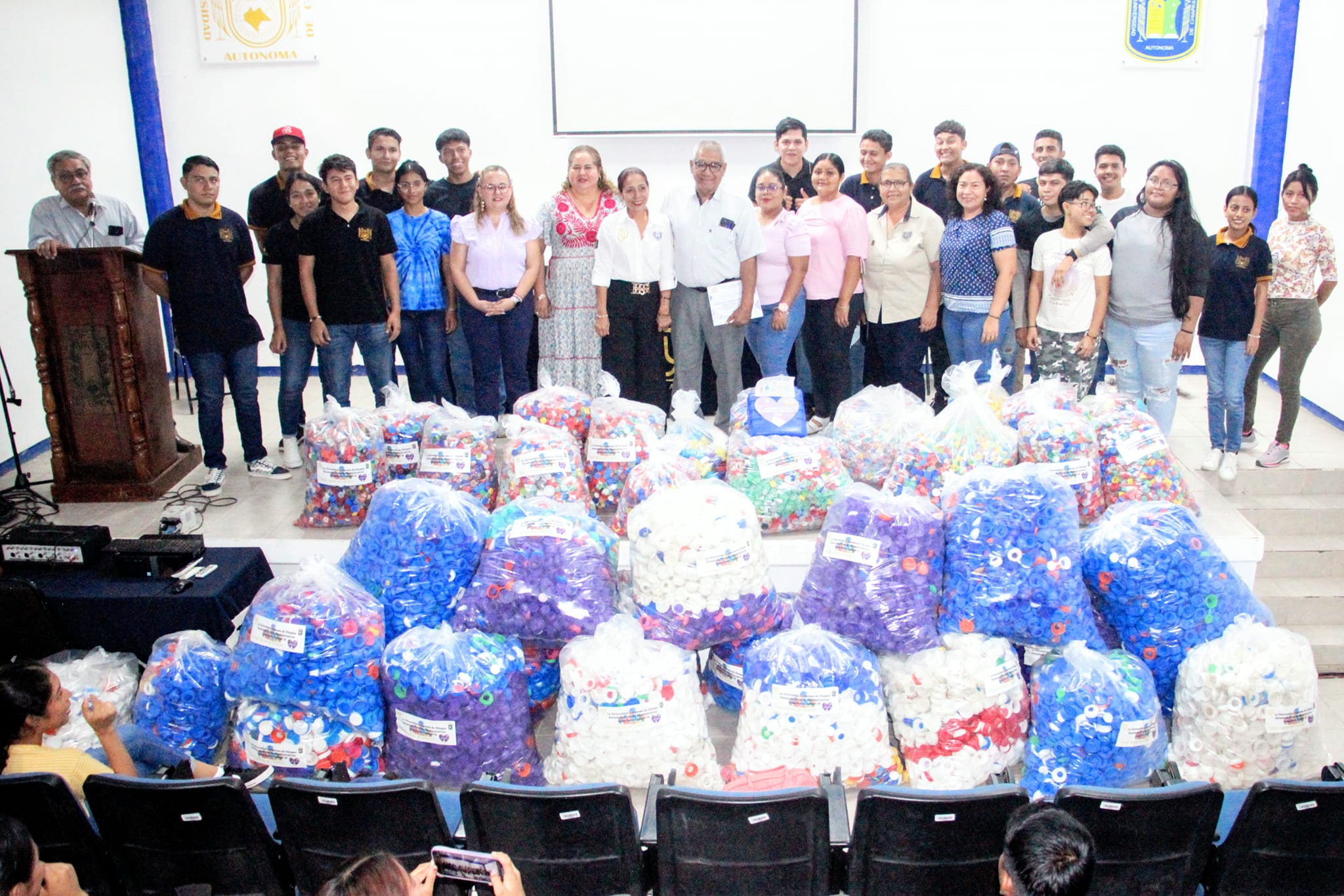 La Presidenta del DIF Municipal de Tonalá, C. Amadita Cigarroa Castillo y la Dra. Katia Velasco Vázquez, Presidenta del Voluntariado DIF-TONALÁ, recibieron del Mtro. Eduardo Ortiz Hernández, encargado de la dirección de la escuela de ciencias administrativas, Dra. Julia María Marroquín Figueroa, coordinadora de extensión universitaria y de la comunidad universitaria, más de 150,000 tapitas de plástico reciclables en el marco del Programa “DONA TAPITAS DE PARA SALVAR UNA VIDA”, acto realizado en el auditorio de la unidad académica de dicho plantel.
