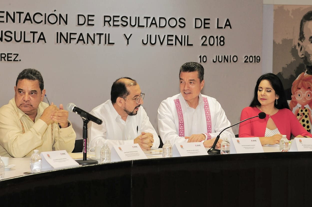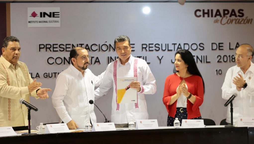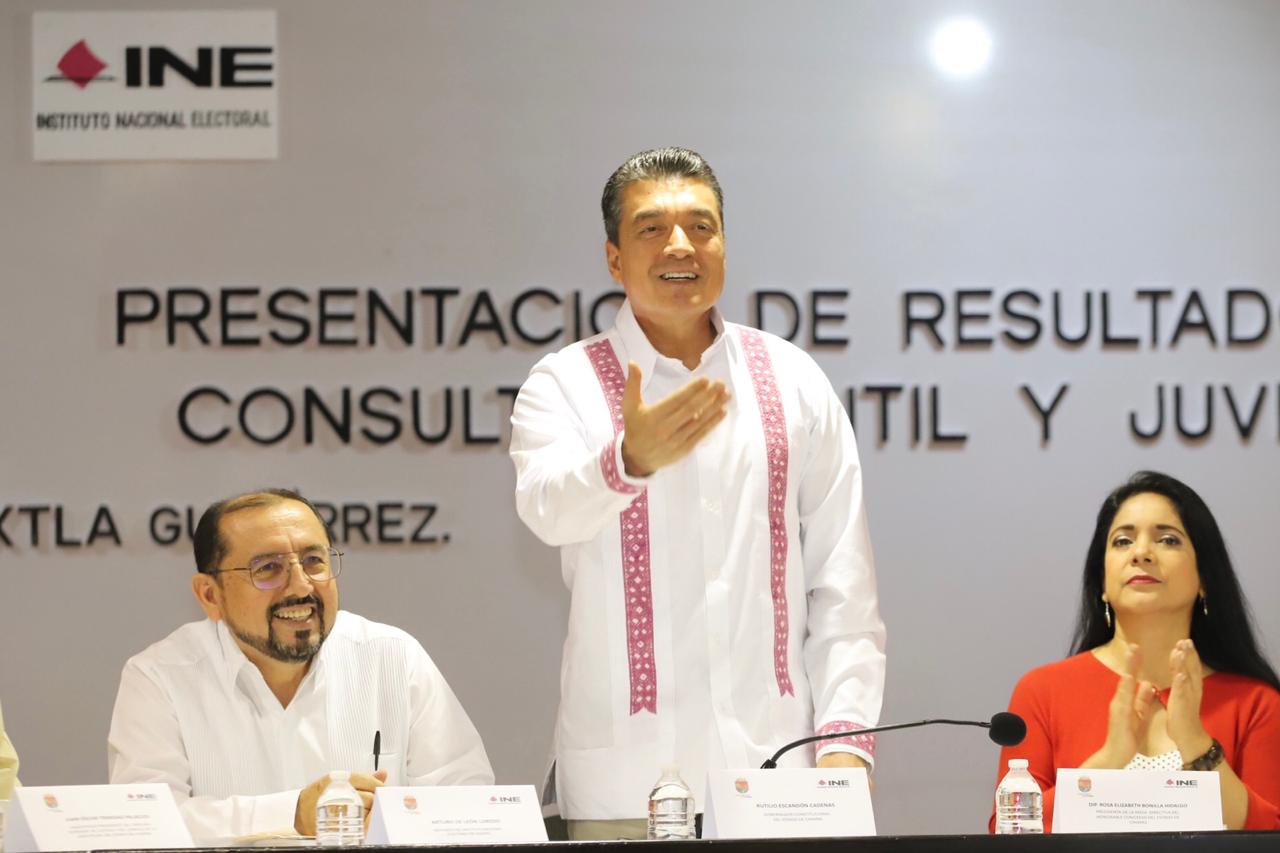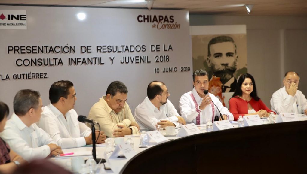 Al escuchar los resultados de la Consulta Infantil y Juvenil 2018, a cargo del Instituto Nacional Electoral (INE), el gobernador Rutilio Escandón Cadenas señaló que las niñas, niños y jóvenes dieron a conocer sus opiniones en busca del bien común y es el deber de las autoridades atender lo que han dejado plasmado a través de este ejercicio.