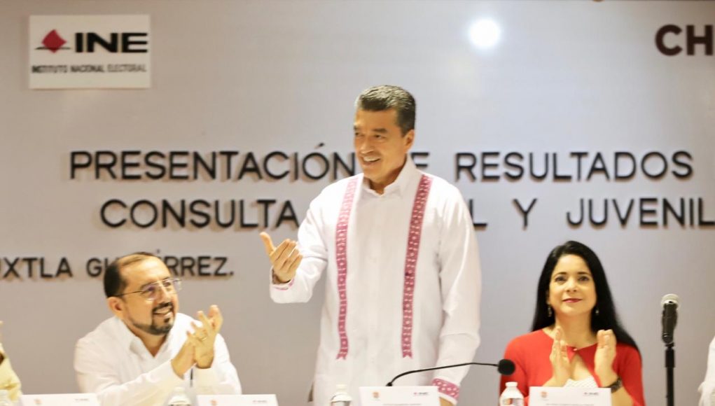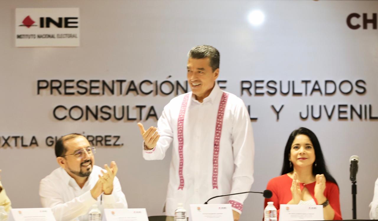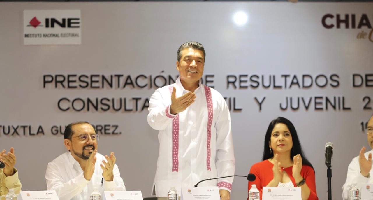 Acompañado del delegado del INE en Chiapas, Arturo de León Loredo, el mandatario destacó la participación de 230 mil niñas, niños y adolescentes de la entidad, por lo que pidió a las instituciones estatales brindar todas las facilidades para abordar las diferentes temáticas de forma detallada, y contribuir en lo que se requiera para que las nuevas generaciones tengan un mejor porvenir.