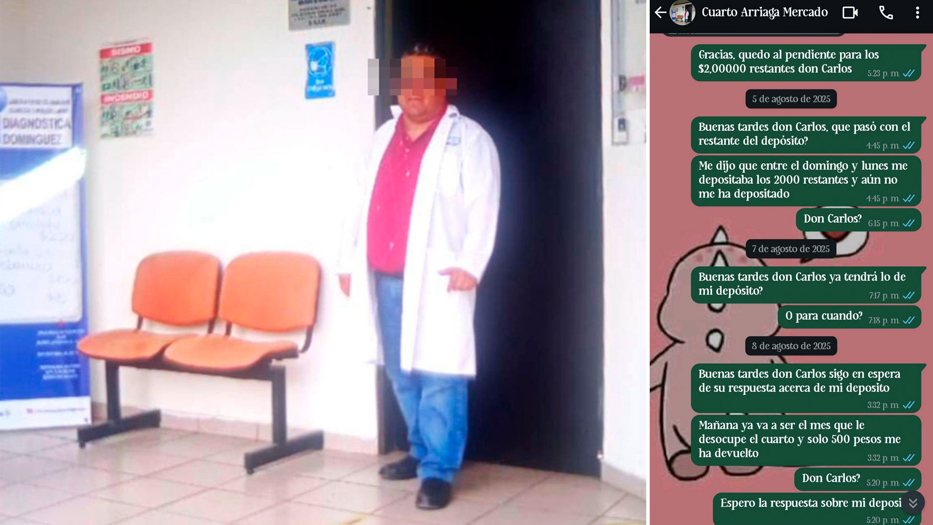 Además, la mujer indicó que, tras mes y medio de haber entregado el cuarto, el arrendador no le ha devuelto el depósito de $2,500 pesos, monto que, de acuerdo con lo pactado, sería reembolsado al finalizar el contrato. Asegura que, tras insistir en múltiples ocasiones, únicamente ha recibido $800 pesos, y que el señor Domínguez le advirtió que, si continuaba exigiendo la devolución, no le regresaría el resto del dinero, señalando que “ya lo estaba hartando” con sus reclamos.