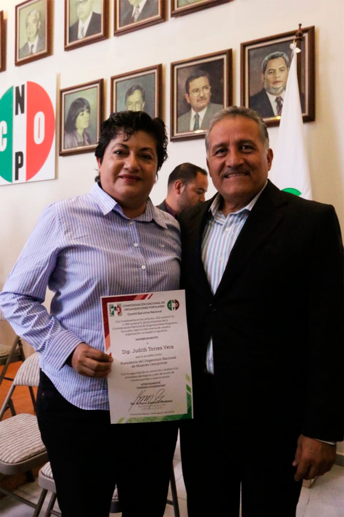 Ciudad de México.- Con el fin de fortalecer sector popular en México, así como de continuar trabajando en un proceso de renovación partidista, la Dirigencia de la Confederación Nacional de Organizaciones Populares (CNOP) tomó protesta a la Diputada Judith Torres Vera como Lideresa del Organismo Nacional de Mujeres Cenopistas, considerando su mérito y talento para con esta organización.