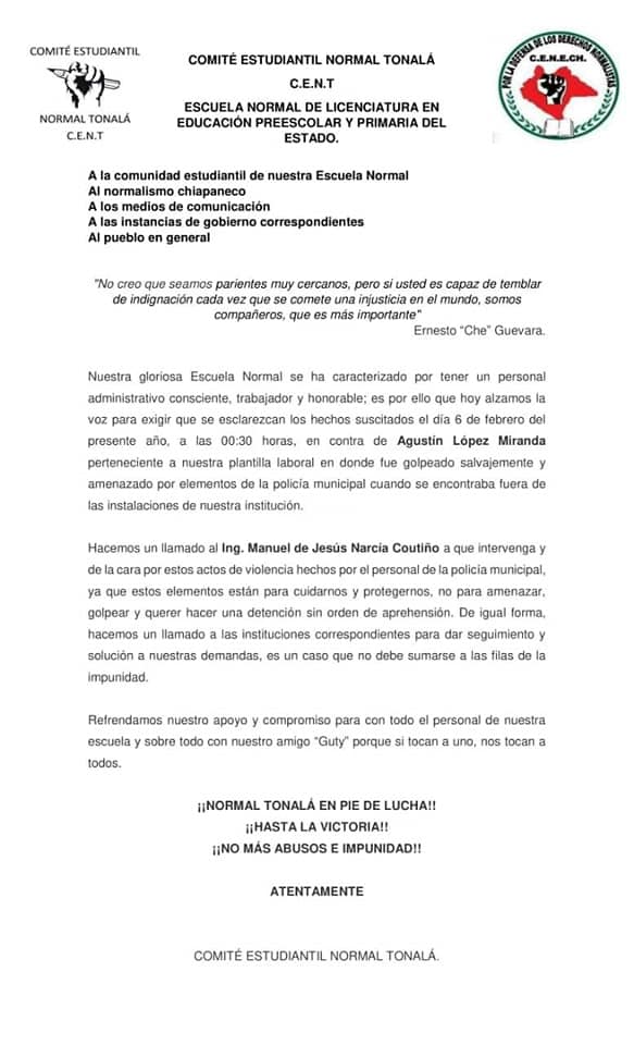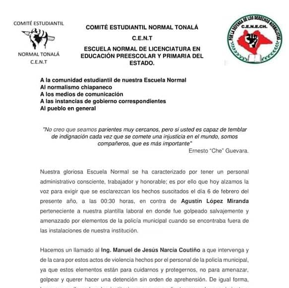 Los estudiantes normalistas en un comunicado al gobierno de Chiapas y a los medios de comunicación que se ejerza la ley y que no haya impunidad ante los agresores.