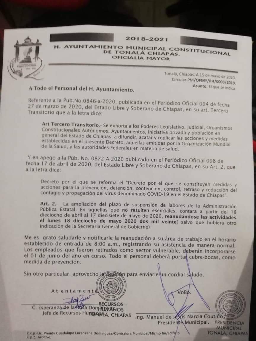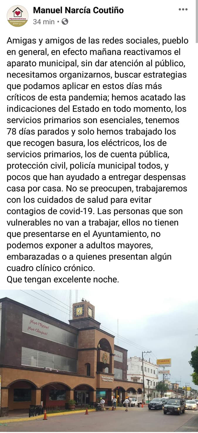 Tonalá, Chiapas.- El día de ayer, 17 de mayo del año en curso el presidente municipal Manuel de Jesús Narcía Coutiño dio a conocer en sus redes sociales que hoy 18 de mayo se deberán de presentar los integrantes de la administración pública municipal a sus labores cotidianas, a excepción de quienes se encuentran en el grupo de riesgo. Situación que originó un debate intenso en redes sociales a través de distintas plataformas informativas.