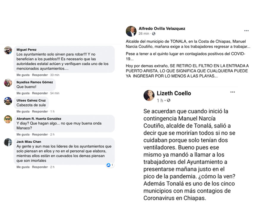Decenas de internautas que tuvieron acceso tanto a la publicación del edil de este municipio costero, como al documento que firmó y publicó en redes sociales, calificaron como una mala decisión el exigir que regrese la mayoría de los integrantes del ayuntamiento tonalteco a las labores cotidianas, justamente en los momentos más críticos de la pandemia, cosa última que señaló el mismo Secretario de Salud en su conferencia de prensa la tarde de ayer 17 de mayo.