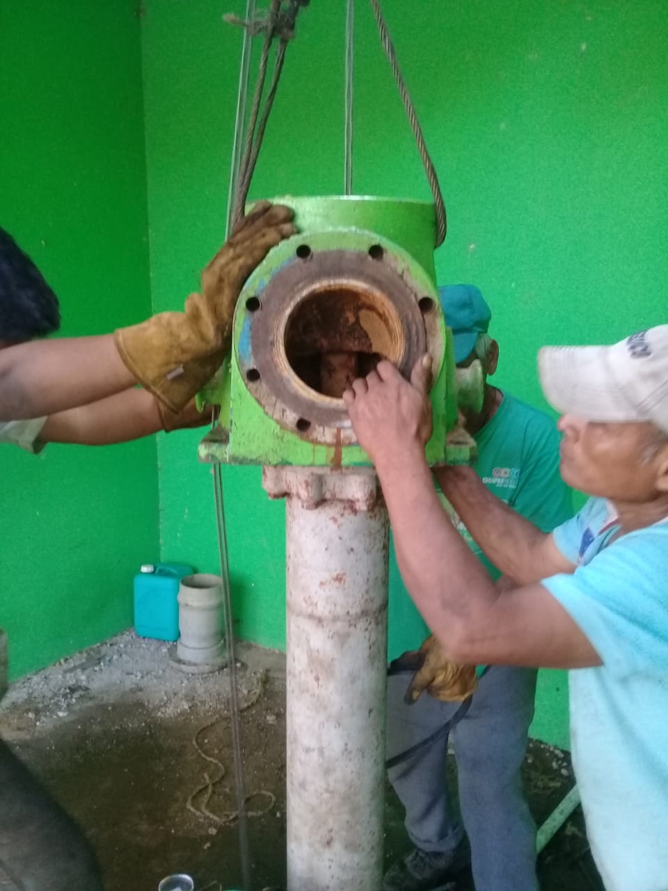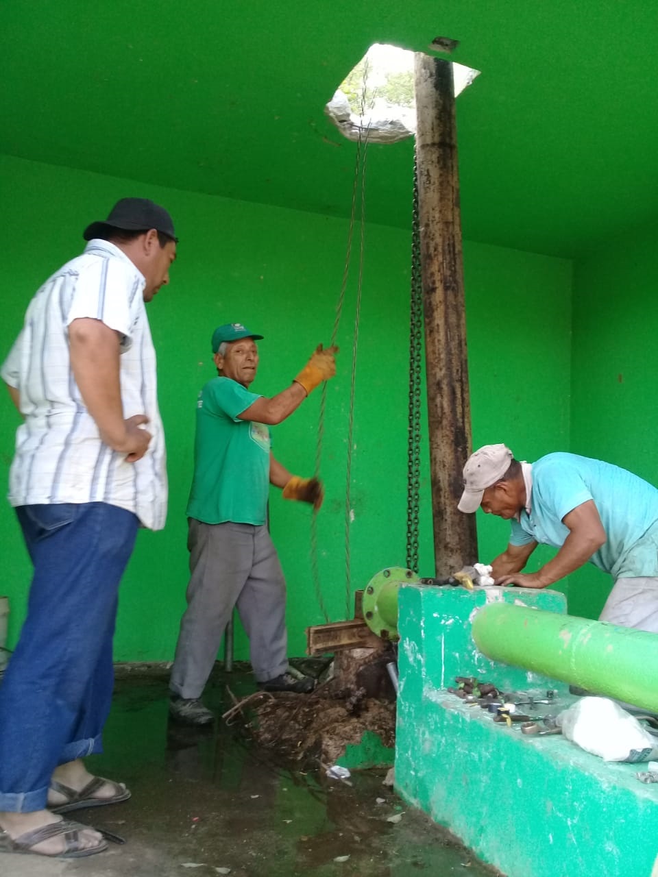 Entre los trabajos urgentes, el personal se encuentra instalando la bomba en el Pozo 2 situado en el “Rancho El Milagro” para el suministro de agua en barrios Juan Sabines, Santa Cecilia y Santa Cruz.