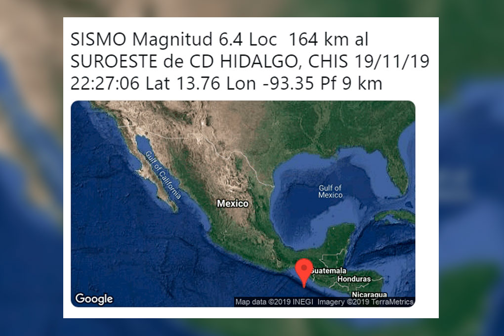 SISMO Magnitud 6.4 Loc 164 km al SUROESTE de CD HIDALGO, CHIS 19/11/19 22:27:06 Lat 13.76 Lon -93.35 Pf 9 km pic.twitter.com/dtdKRvCdtV