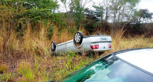 Vuelca Jetta tras estallarle la llanta trasera